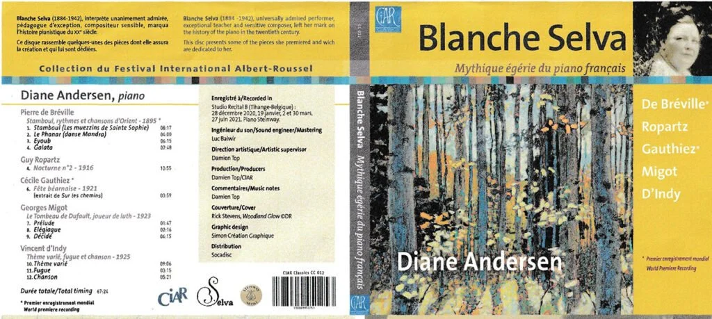 L’éminente pianiste, Diane Andersen, présidente pour la Belgique de l’EPTA, European Piano Teacher’s Association, et qui peut parler en connaissance de cause de la méthode d’enseignement du piano de Blanche Selva, vient d’enregistrer pour le label CIAR Classics des œuvres lui étant dédiées et dont elle fut la créatrice.